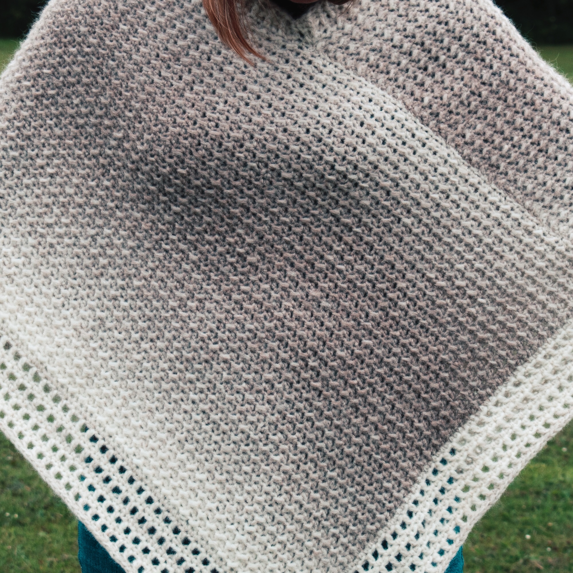 As soon as it started working up I was in love with this yarn. It is not heavy at all – in fact you will be surprised how light your project feels! The drape is gorgeous, the colours are stunning and my poncho feels squishy (I just want to feel it all of the time!). And it is so warm to wear too which makes this yarn perfect for those autumn and winter projects! There is an element of wool in it so if you are allergic you will need to keep this in mind.