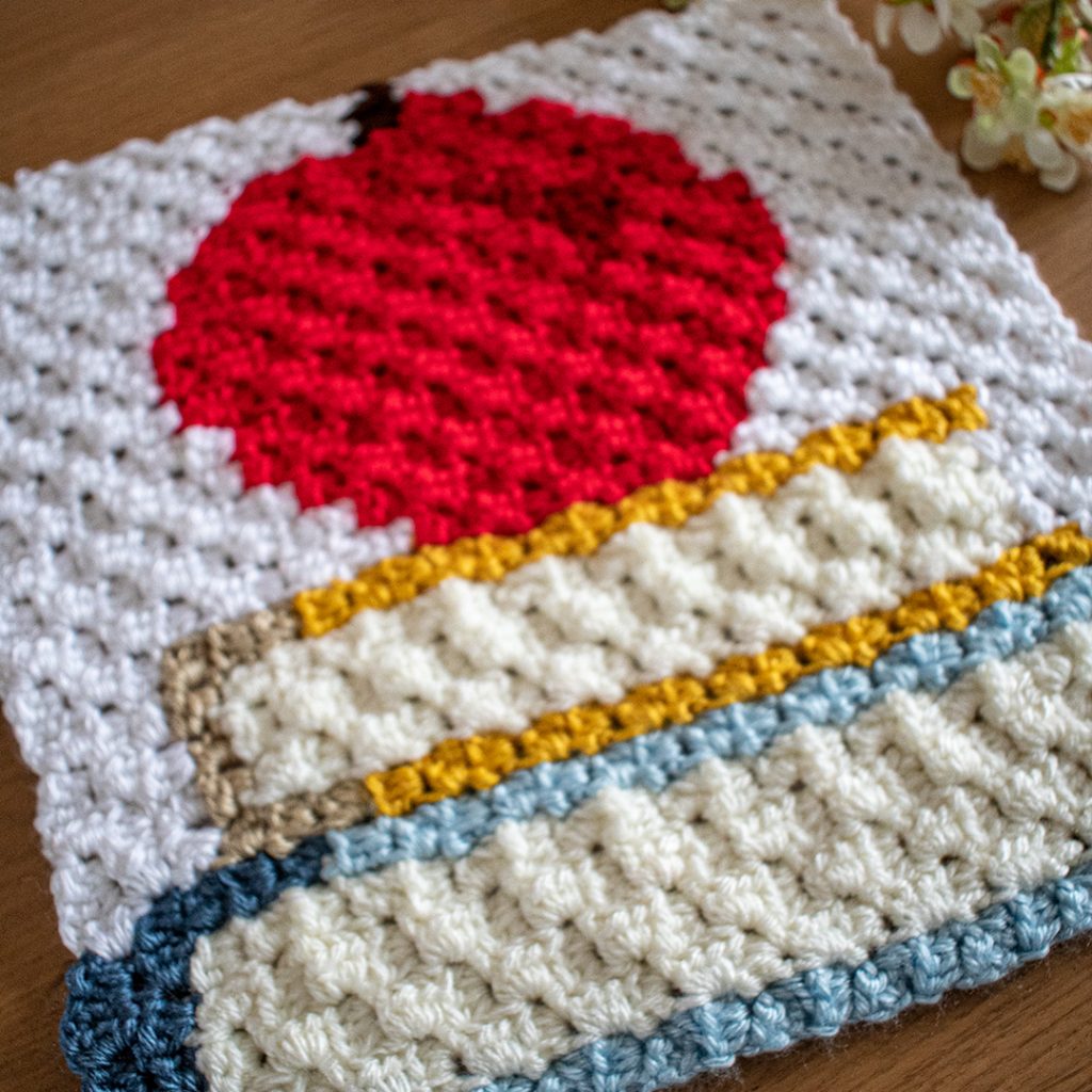 This square is part of the Kinship CAL. It is a corner to corner block which is 25 x 25 blocks in size. I created mine using the half double crochet method rather than double crochet. But you can use either depending on the size you are after creating.