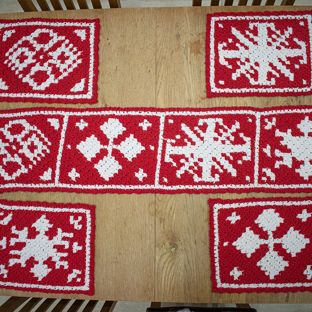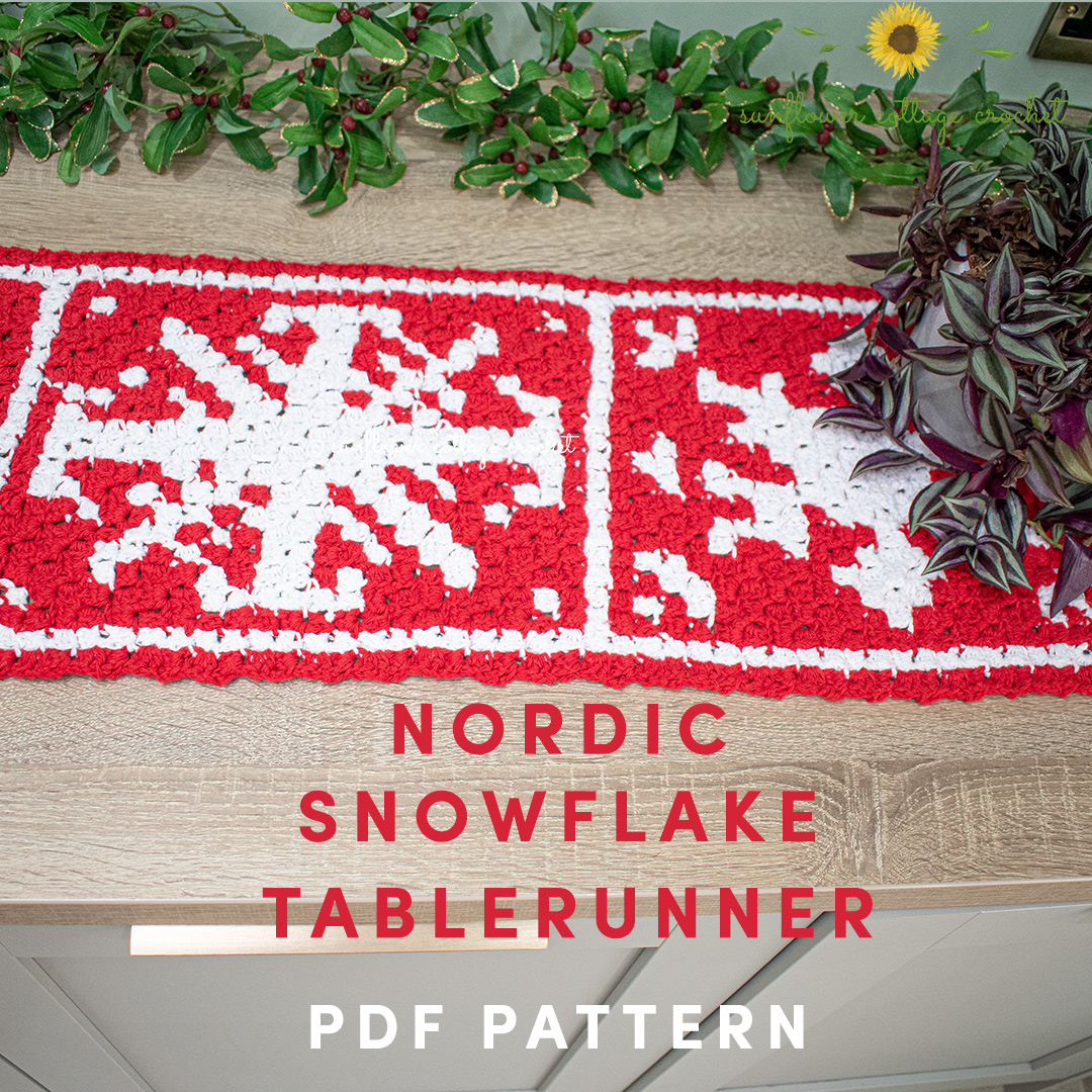 The Nordic Snowflake Table Runner was most definitely inspired by the Nordic Winter Afghan CAL. You can find out more about that and get the free chart for the square I designed here. There is also a gorgeous e-book available if you want to make the afghan.