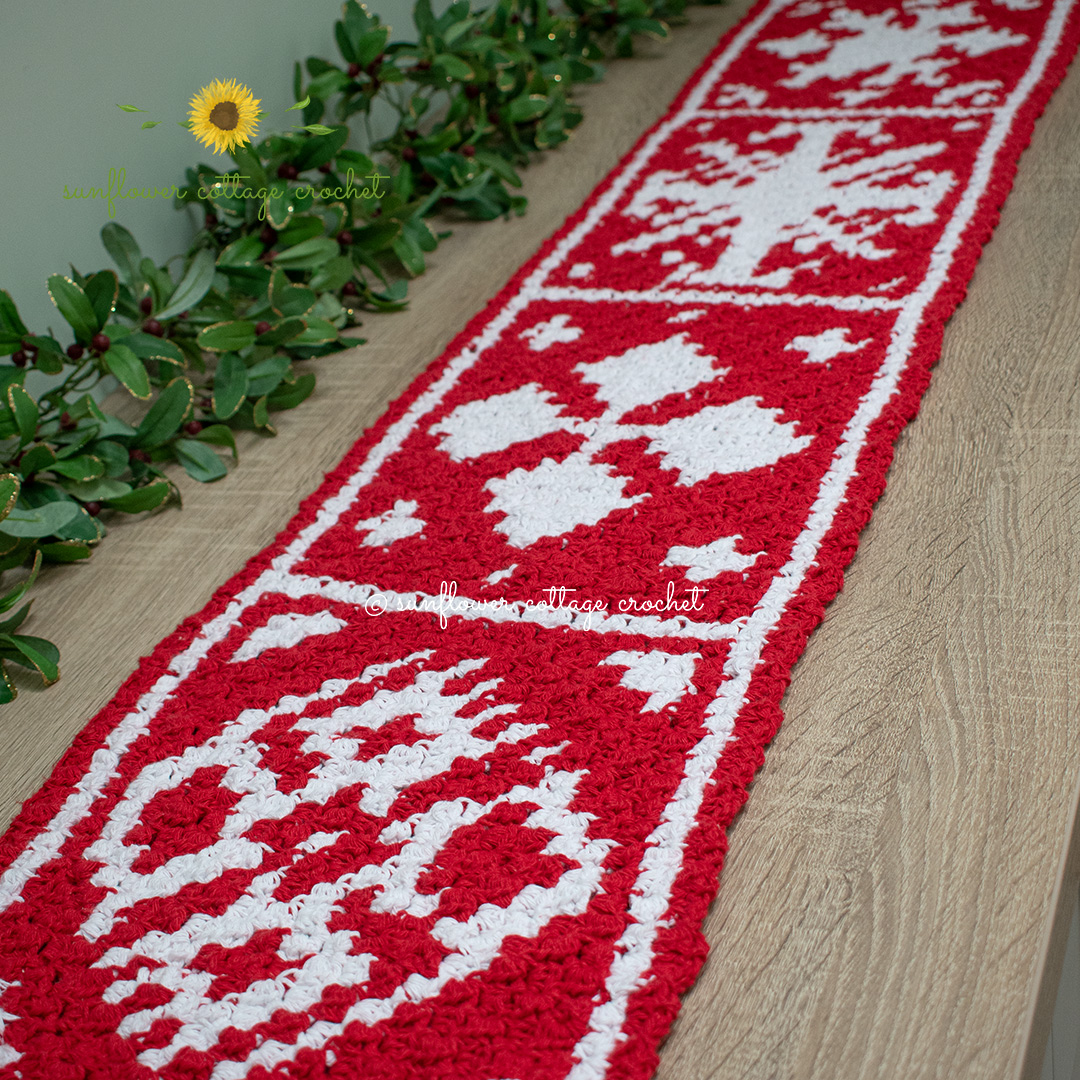 This one was a fun pattern to design and make. I have been wanting to do more corner to corner projects for a little while. The Nordic Winter Afghan gave me the perfect opportunity and once I started I just kept going. This runner is made in one piece so there is no joining. It is made using the corner to corner method. I used the half double crochet stitch with a ch2. You can use the double crochet stitch with ch3 if you prefer but be aware that your project will end up wider and longer.